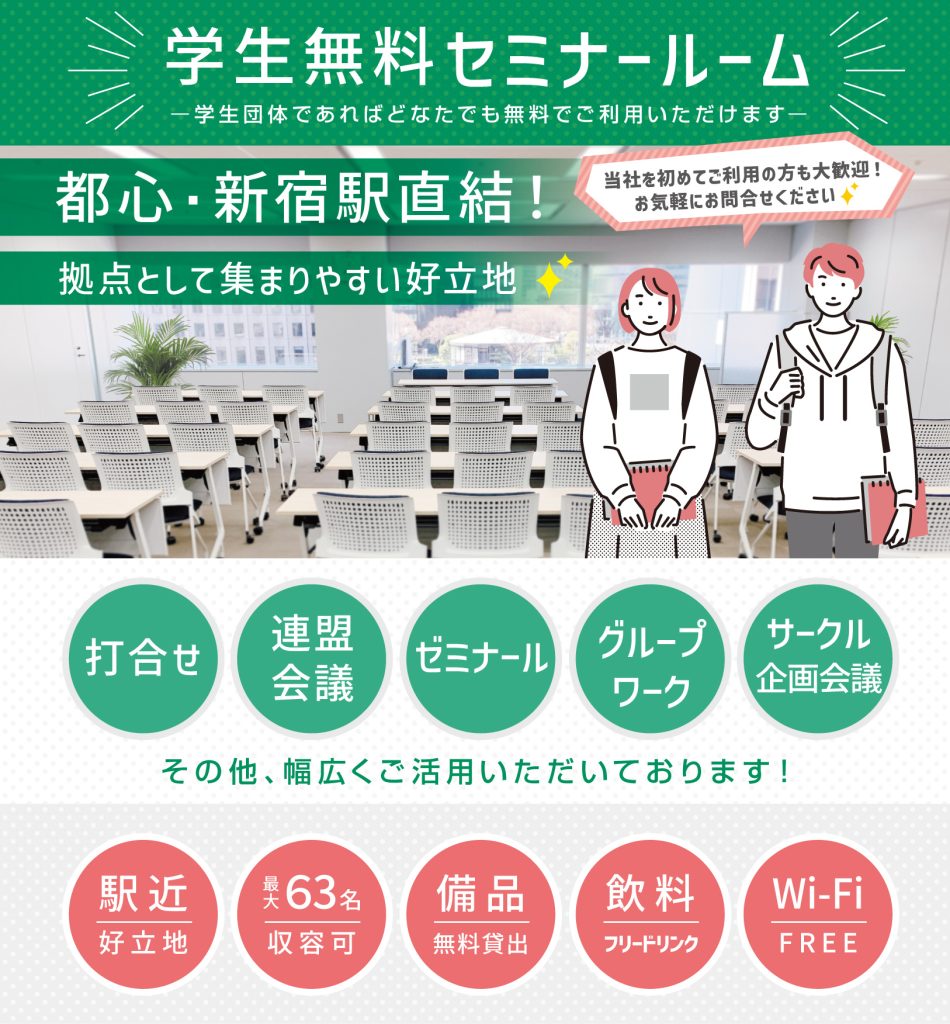 学生団体を対象に、当社新宿旅行センター内のセミナールームを無料でご利用いただけます。